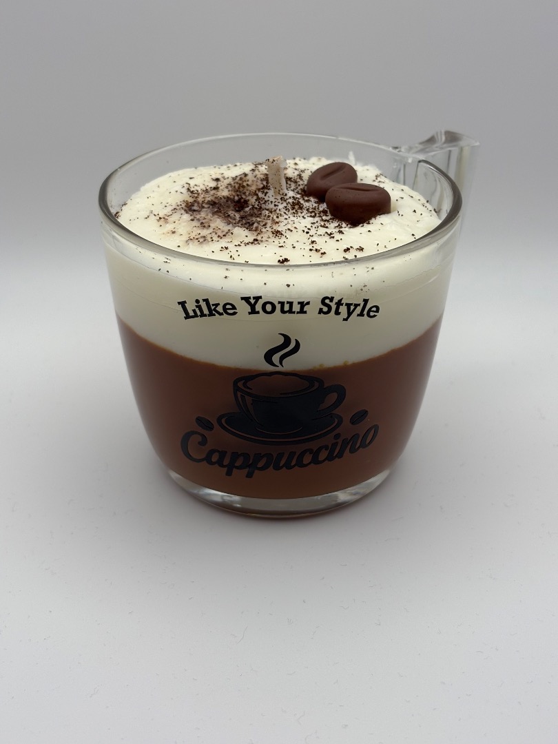 Koffieliefhebbers, opgelet! Deze 'Cappuccino Kaars' brengt de heerlijke geur en gezellige sfeer van je favoriete koffiemomentje direct in huis! Kijk eens naar die perfecte 'melkschuimlaag' en de realistische 'koffiebonen' bovenop. Het is bijna alsof je een warme kop in je handen hebt!